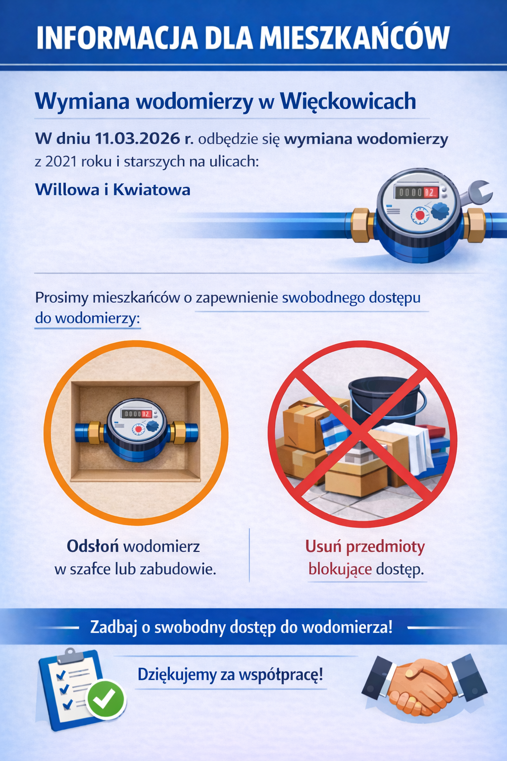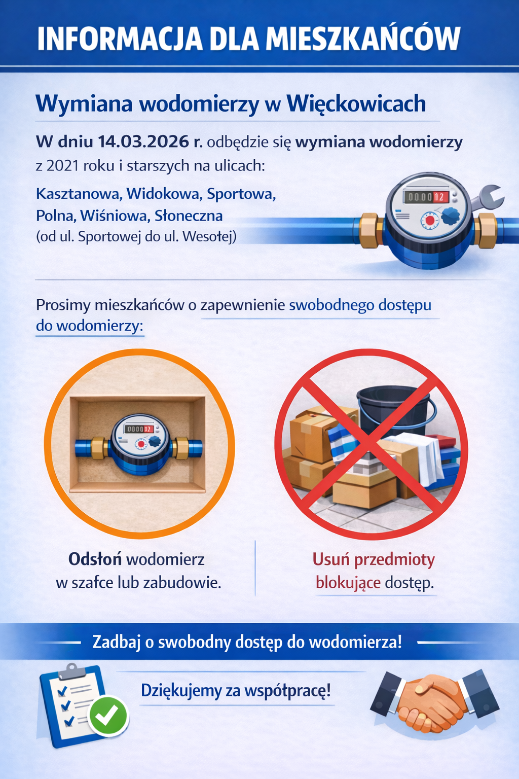 Dziękujemy za współpracę i zrozumienie. Jesteśmy przekonani, że nowy system wodomierzy radiowych przyczyni się do lepszego zarządzania zużyciem wody oraz zwiększenia komfortu rozliczeń dla mieszkańców naszej gminy.